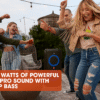 It’s got wheels and a handle, a splash-proof design (IPX4), built-in lights that sync to music, and mic/guitar inputs so you can sing or jam along. You can stream via Bluetooth, use USB, or pair two speakers via True Wireless Stereo (TWS) for even bigger sound.